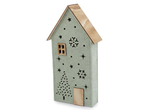 Svítící dekorační domeček má základ z pevného filcu a střechu a detaily ze dřeva. Ze přední strany má výřezy v podobě vloček, hvězdiček a stromečku. Svítí příjemným teplým světlem. Zútulní každý interiér. Baterie (2x CR2032) jsou součástí balení.