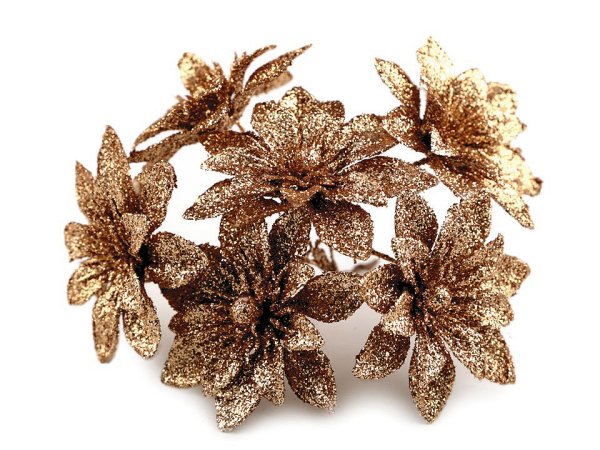 Rozkvetlé vánoční hvězdy nesmí chybět v žádném vánočním aranžmá. Jejich povrch se třpytivými glitry dodá vašemu domovu nádech elegance a luxusu. Květy vánoční hvězdy jsou připevněny k ohebnému drátku, kterým lze lehce manipulovat. V jednom svazku je 6 květů vánočních hvězd. Použití: Jednotlivé květy můžete snadno naaranžovat na věnce, květinové vazby či sváteční tabuli. Jsou vhodné i na zapichování do polystyrenových polotovarů.