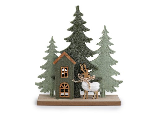 Dekorační les má základ z pevného filcu, podstavec a drobné detaily jsou ze dřeva a korku. Dekorace zútulní každý interiér. Vynikne na okenním parapetu, krbové římse, poličce i na sváteční tabuli.