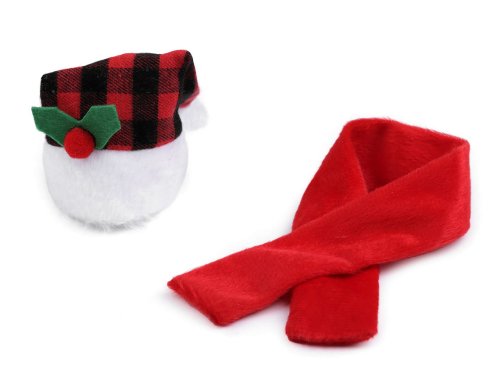 Malá vánoční čepice s šálou originálně ozdobí například láhve piva či vína nebo s ní můžete dotvořit postavičky. Čepice je lemovaná umělou kožešinkou, šála je z měkkého plyše. Obvod čepice je cca 14 cm. Její výška je cca 7 cm. Obvod šály je cca 16 cm, šířka 3 cm.