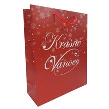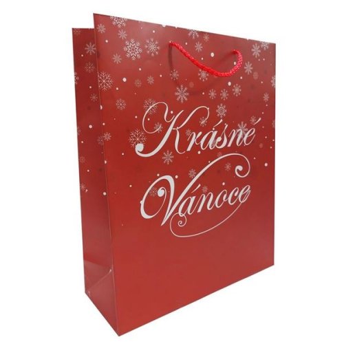 • Červená dárková taška s bílým nápisem Krásné Vánoce