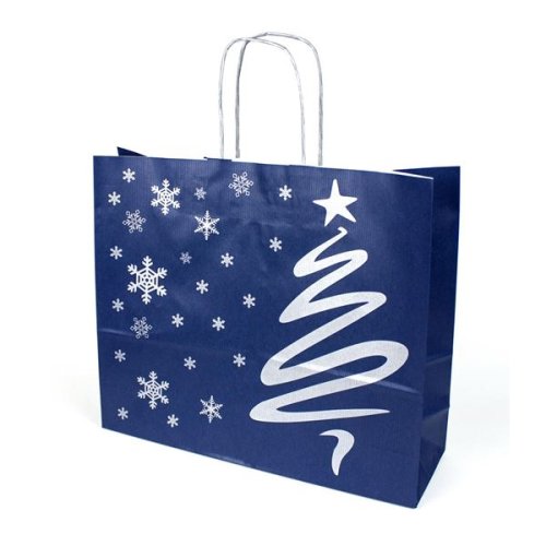 Modrá dárková taška s motivem bílého stromečku a hvězd