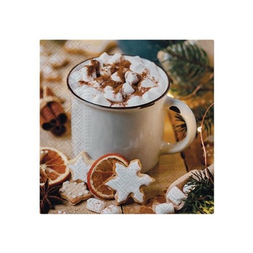Papírový vánoční ubrousek s motivem zimního horkého nápoje, sušených pomerančů a perníčků je vyroben z velmi kvalitního třívrstvého papíru Tento ubrousek je ideální pro využití při vánočním stolování …