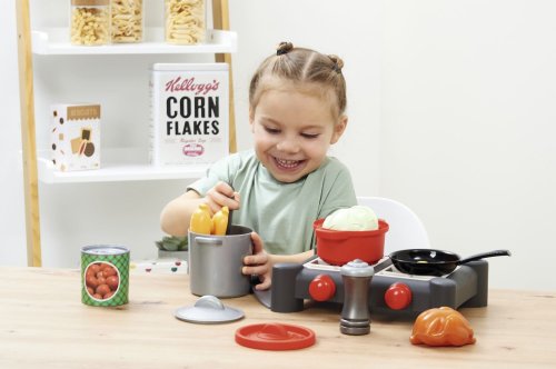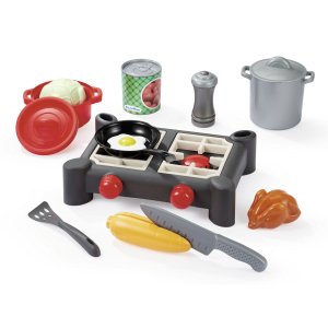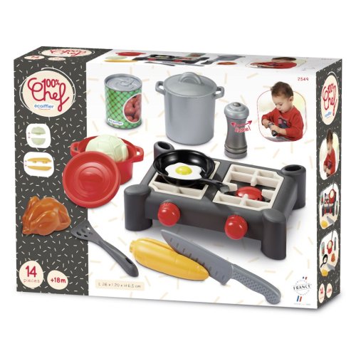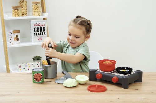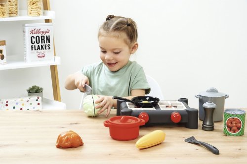 Dvouplotýnkový vařič se sadou hrnců s pokličkami, rendlíky, pánvičkou, potravinami a dalším příslušenstvím. Sada obsahuje 14 ks. Rozměry variče 21 x 17 x 5 cm.