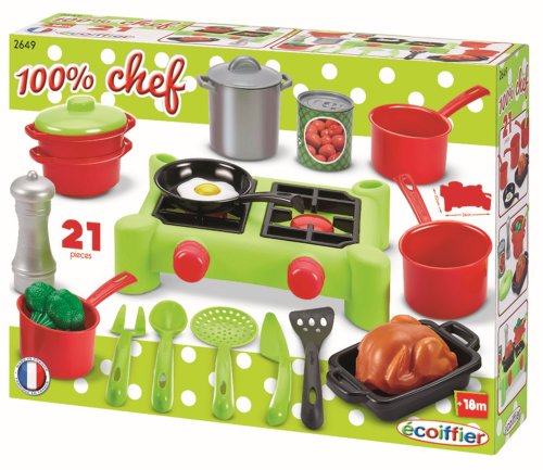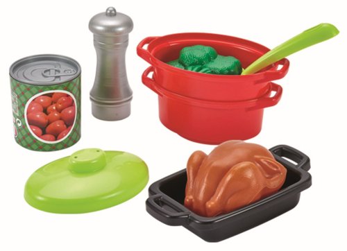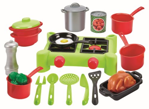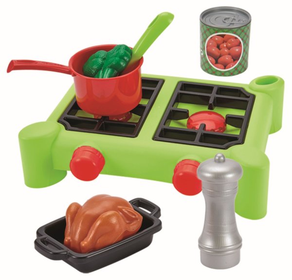 Dvouplotýnkový vařič se sadou hrnců s pokličkami, rendlíky, pánvičkou, pekáčem, potravinami a dalším příslušenstvím. Sada obsahuje 21 ks. Rozměry vařiče 26 x 20 x 6,5 cm.