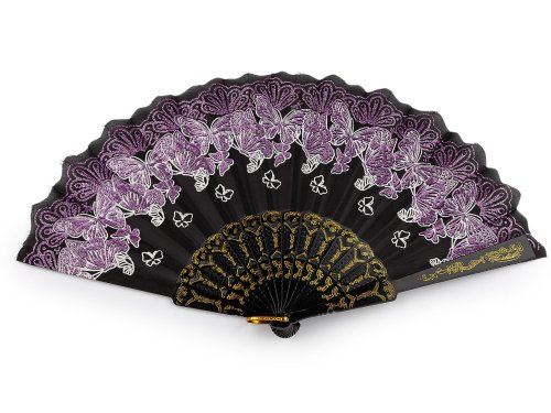 Textilní vějíř zdobí potisk motýlů, který je doplněný třpytivými glitry. Využijete ho na společenské události, na karnevaly i různá taneční vystoupení. Rukojeť je plastová s poutkem. Vějíř se může stát elegantním doplňkem pro večerní procházky nebo dovolenou v exotických destinacích. Je nejen módním doplňkem, ale i praktickým pomocníkem v horkých letních dnech. Přinese vám příjemné osvěžení a zvýrazní váš osobní styl.