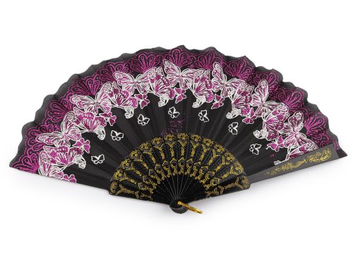 Textilní vějíř zdobí potisk motýlů, který je doplněný třpytivými glitry. Využijete ho na společenské události, na karnevaly i různá taneční vystoupení. Rukojeť je plastová s poutkem. Vějíř se může stát elegantním doplňkem pro večerní procházky nebo dovolenou v exotických destinacích. Je nejen módním doplňkem, ale i praktickým pomocníkem v horkých letních dnech. Přinese vám příjemné osvěžení a zvýrazní váš osobní styl.
