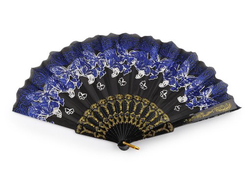 Textilní vějíř zdobí potisk motýlů, který je doplněný třpytivými glitry. Využijete ho na společenské události, na karnevaly i různá taneční vystoupení. Rukojeť je plastová s poutkem. Vějíř se může stát elegantním doplňkem pro večerní procházky nebo dovolenou v exotických destinacích. Je nejen módním doplňkem, ale i praktickým pomocníkem v horkých letních dnech. Přinese vám příjemné osvěžení a zvýrazní váš osobní styl.