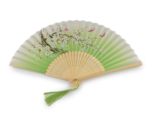 Textilní vějíř využijete na společenské události i na karnevaly. Zdobí ho květinový potisk s metalickými detaily. Má dřevěnou rukojeť s vyřezanými ornamenty. Dole je ozdobený střapcem. Vějíř se může stát elegantním doplňkem pro večerní procházky nebo dovolenou v exotických destinacích. Je nejen módním doplňkem, ale i praktickým pomocníkem v horkých letních dnech. Přinese vám příjemné osvěžení a zvýrazní váš osobní styl.