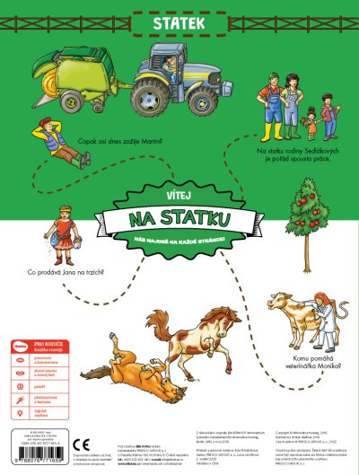 Víte, jak to vypadá na takovém statku? Podívejte se k Sedlákovým – na jejich hospodářství žije spousta zvířat, hemží se to tady pomocníky a můžete sledovat nejrůznější zemědělské stroje v akci! Vedle tvrdé práce tu na vás čekají i mnohá dobrodružství a dobrá zábava.Vítejte na statku rodiny Sedlákových. Tahle velká obrázková knížka vás provede všemi kouty hospodářství a vy tu prožijete celý úžasný den! Poznáte zvířata, která zde žijí, lidi nejrůznějších profesí, kteří tady pracují a pomáhají. Budete sledovat impozantní zemědělské stroje při práci a také se bavit, třeba na jezdeckém turnaji nebo na koncertě. Některé postavičky a zvířátka můžete hledat na každé dvojstránce znovu a znovu a sledovat jejich příběhy. Je to docela fuška, ale hlavně velké dobrodružství a zábava!