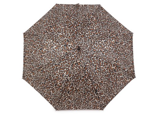 Velký dámský deštník se zvířecím vzorem je stylovým a praktickým doplňkem pro každou ženu. Díky svému atraktivnímu designu, dodá šarm i těm nejzamračenějším dnům. Je vystřelovací, konstrukci má z kovového drátu a pružných lamel, které tvoří osm polí. Díky nim je velice pevný, neohne se ani za největšího nečasu. UV filtr vás ochrání před slunečním zářením. Klasická tyč je zakončená pevnou rukojetí. Hloubka deštníku je 26 cm.