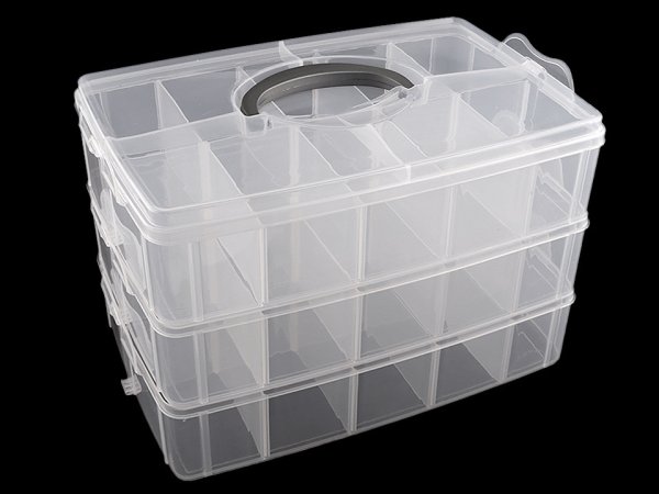 Třípatrový rozkládací zásobník se hodí na skladování komponentů pro kreativní tvorbu. Každý zásobník je víkem toho spodního, se kterým se spojí sponou na boku zásobníku. Vrchní patro má odnímatelné víko s uchem na přenášení. Také se zavírá na sponu. Dovnitř je vidět díky průhlednému plastu. Přihrádky si můžete regulovat pomocí odstranitelných přepážek (1 x dlouhá vcelku, 8 x krátké jednotlivé), pokud odstraníte všechny, budete mít celé patro volné o prostoru 18 x 31 x 8 cm. Pokud použijete všechny přepážky, velikost malých přihrádek, kterých bude 10 ks na jednom patře, bude 6 x 9 cm. Hloubka přihrádky je 7 cm. Na každém patře je to stejné, pořadí pater můžete měnit.