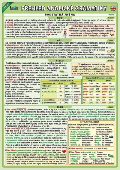 Ucelený přehled anglické gramatiky nově ve větším a přehlednějším formátu A4, obohacený o ilustrace. Přehled je členěn podle slovních druhů, dále obsahuje přímý a obrácený slovosled, časovou souslednost, souvětí a stranu s přehlednou tabulkou tvarů nepravidelných sloves. Je vhodný pro studenty základních a středních škol.