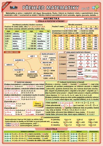 Přehledně zpracované učivo matematiky pro základní školy nově ve větším a přehlednějším formátu A4 – od základních početních výkonů až po geometrii a statistiku. Přehled mimo jiné obsahuje převodní tabulku jednotek, slovní a konstrukční úlohy, grafy, nákresy, tabulky, řeckou abecedu a stranu s tabulkou vzorců v geometrii.