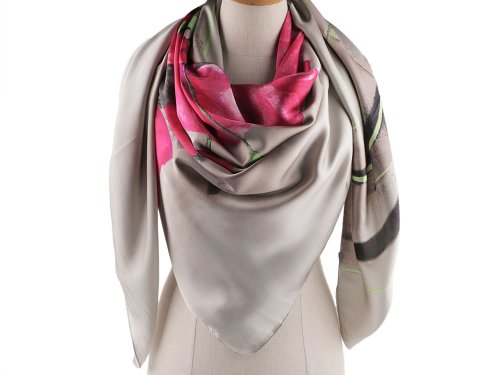 Velký saténový šátek s květy 130x135 cm - šedá světlá