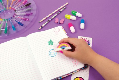 Velká otočná sada kancelářských potřeb obsahuje blok, 20 mini gelových per, 2 gumy, 2 barevné tužky, 4 zvýrazňovače, 4 vinylové samolepky.