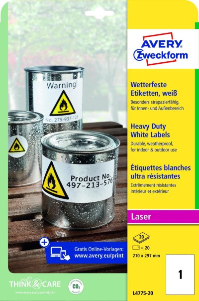 • Bílé polyesterové etikety jsou odolné vůči stříkající vodě, nečistotám, mastnotě, roztržení, UV záření a teplotám od -20°C do +80°C