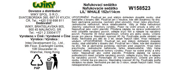 Nafukovací velryba s úchyty pro lepší rovnováhu. S velrybou si užijete spoustu zábavy. Rozměr 152x114 cm. Vhodné od 3 let.