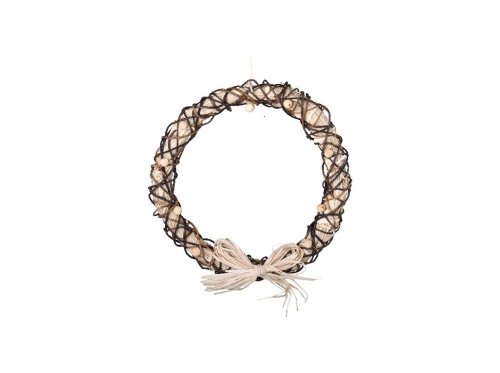 Přírodní věnec o průměru 300 mm je ozdoben zlatým dekorem a dřevěnými korálky. Dekorace dodává interiéru teplý a slavnostní vzhled. Vhodný pro zavěšení na dveře, stěnu nebo použití v aranžmá, vytváří útulnou a elegantní atmosféru.