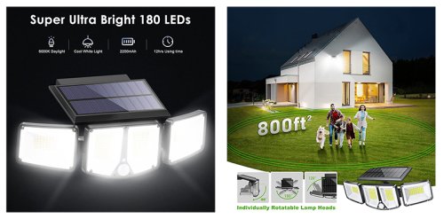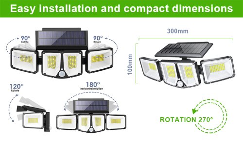 *180 LED diod se světelností 1200 lm *Solární napájení *Jednoduchá instalace na zeď nebo do země *Dostatečný výkon pro celonoční osvětlení *3 světelné módy intenzity světla *Rozptyl světla až do 270° na vzdálenost až 74m2 díky rotaci světla *Odolnost proti dešti a vodě IP65 *Doba svitu 8-12 hodin podle intenzity světla *Automatické spuštění a detekce noci