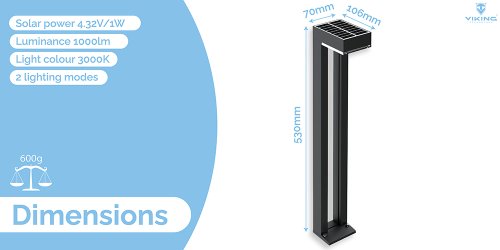 Technické specifikace světla: Model: Venkovní solární LED světlo Viking SR07 Svítivost: 1000 lm Barva světla: 3000K, Ra>70 Typ světla: LED (OSRAM) 2835, 4ks Doba osvětlení za nevhodných podmínek: >10 dní Režim ovládání: •tlačítko, zapnutí/vypnutí stisknutím na 1,5s Režim osvětlení: •M1: 100% (2H) + 80% (1H) + 60% (1H) + 40% (1H) + 20% do svítání •M2: 50% do svítání Indikace režimu: •Aktivace režimu M1: blikne jednou •Aktivace režimu M2: blikne dvakrát Technologie: ALS2.3 Ochrana: IP54 Rozměry: 53 x 10,6 x 7 cm