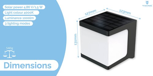 Svítivost 1000 lm • solární napájení • barva světla 4000K (denní bílá) • 3 režimy osvětlení • doba osvětlení za nevhodných podmínek více než 10 dní • odolnost IP54 • kapacita baterie 3,7V/7,4 Wh • výkon solárního panelu 4,86 V/1,5 W