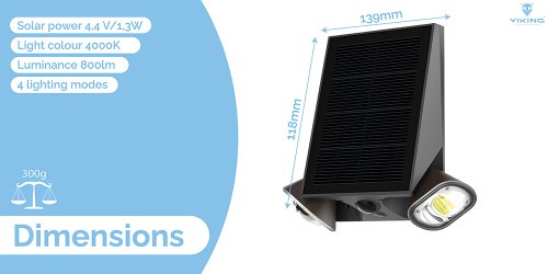 Technické specifikace světla: Model: Venkovní solární LED světlo s pohybovým senzorem Viking SR39 Svítivost: 800 lm (levé a pravé světlo, každé 400 lm) Barva světla: 4000K, Ra>70 Typ světla: LED 2835, 24ks (levé a pravé světlo, každé 12ks) Světelné pokrytí: 20m2 Doba osvětlení za nevhodných podmínek: >7 dní Režim ovládání (vypínač ON/OFF):