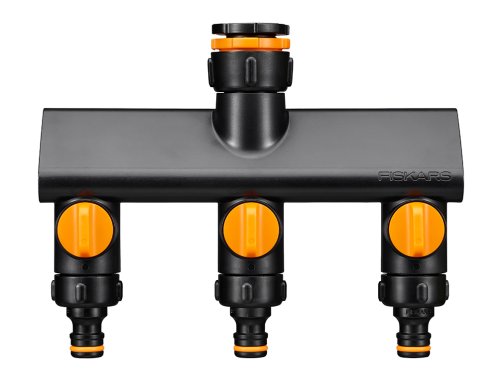 Trojcestný kohoutkový ventil Comfort, FISKARS. Rozděluje jeden zdroj vody na tři přípojky s nezávislými regulačními ventily. Koncové rychlospojky lze odšroubovat pro připojení dalšího příslušenství se závitem G3/4 palce (např. zavlažovací počítač). Vhodný pro připojení na vodovodní kohoutek s velikostí závitu průměr 21 mm (G1/2palce), průměr 26,5 mm (G3/4 palce), průměr 33,3 mm (G1 palec). Univerzální připojení je kompatibilní s ostatními značkami. Rozměry: šířka 20,5 cm, délka 5,1 cm, výška 20,5 cm. Fiskars číslo: 1070578.