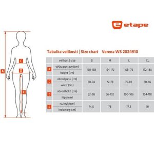 Sportovní kalhoty ETAPE Verena WS jsou ideální volbou pro ženy, které hledají pohodlné a funkční kalhoty na cyklistiku, běhání či jen běžné nošení při teplotách od -15 °C do 5 °C. Kalhoty jsou vyrobené z funkčního a elastického materiálu SoftShell, který je odolný větru a vodě s vynikajícími termoizolačními a transpiračními vlastnostmi. Díky třívrstvé struktuře nabízí maximální komfort a ochranu. Navíc díky materiálu ThermoFit kalhoty nabízí skvělé thermoizolační vlastnostni, jsou elastické, měkké, příjemně na dotek a mají antibakteriální úpravu. Verena WS: - materiál SoftShell s membránou a zateplením - materiál ThermoFit se zateplením - pohodlný volný střih - elastický pas s tkanicí na stažení - 2 kapsy na zip - zipy na nohavicích pro pohodlné oblékání - protiskluzový silikonový pásek na nohavicích - reflexní bezpečnostní prvky - teplotní rozsah: -15 °C až 5 °C Velikostní tabulka v obrázcích. Uvedené hodnoty jsou pouze orientační a vhodná velikost se může lišit dle konkrétního typu postavy.