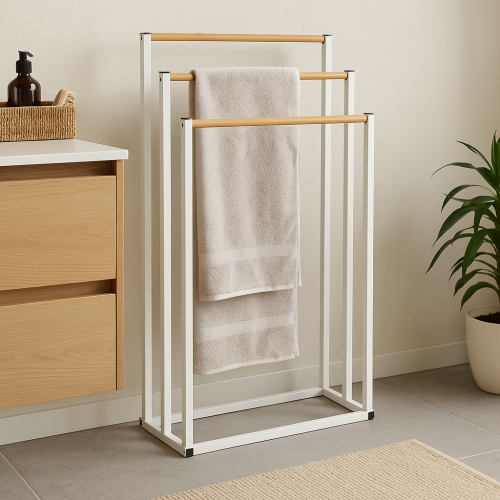Stylový a praktický věšák na ručníky v kombinaci železné konstrukce s práškovým lakem v bílé barvě a přírodního bambusu. Díky třem věšákům poskytuje dostatek prostoru pro sušení a ukládání ručníků. Stabilní a elegantní doplněk do každé koupelny.