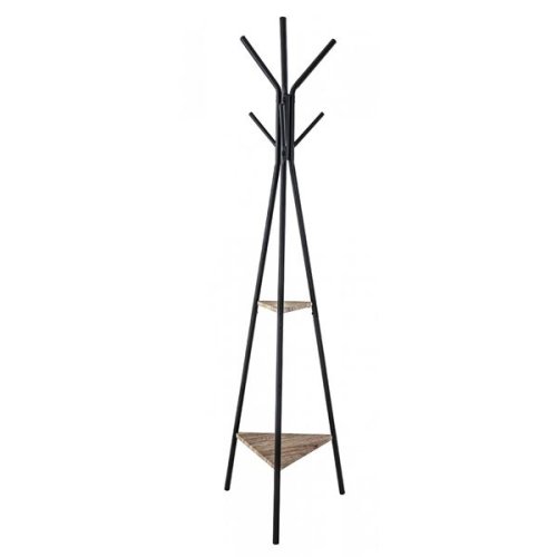 Stojací věšák v moderním designu na svrchní oblečení Ideální do domácího interiéru, čekárny nebo kanceláře Vyrobeno z odolné práškově lakované oceli Má 6 háčků na zavěšení oblečení Dvě další MDF police …