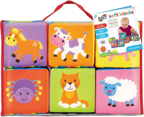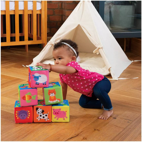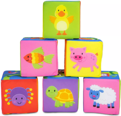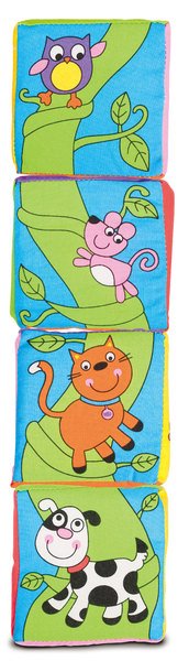 Zábava pro malé stavitele! Měkké kostky s barevnými motivy zvířátek a dopravních prostředků. Děti si mohou postavit komín s motivem zvířátek na dlouhém stonku rostliny, vytvořit dlouhou kolonu dopravních prostředků a nebo poskládat dvojičky identických obrázků. Na kostkách je 12 párů zvířátek. Balení obsahuje 6 kostek. Svrchní část každé kostky je vyrobena z textilu, vnitřek kostky pak tvoří měkká pěna. Rozměr jedné kostky: cca 10 x 10 x 10 cm. Kostky jsou uloženy do plastového obalu, do kterého je můžete po ukončení hry opět uložit. Hračka podporuje koordinaci oko-ruka, jemnou motoriku a rozvoj dětské představivosti. Vhodné pro děti od 6 měsíců.