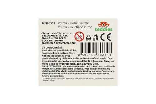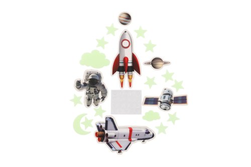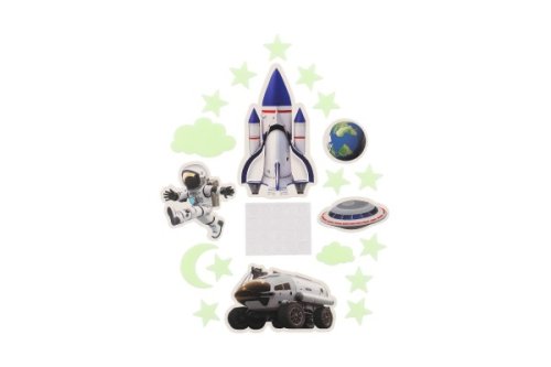 Sada obsahuje krásné vesmírné motivy, které se po nasvícení ve tmě rozsvítí a vytvoří okouzlující atmosféru plnou hvězd a planet. Tyto dekorace jsou ideální pro malé objevitele vesmíru, kteří si chtějí přinést kousek galaxie domů. Svítící vesmírné motivy nejenže zpříjemní večerní hodiny, ale také pomohou dětem usnout v kouzelném prostředí plném hvězd. Rozměry balení 17 x 25 x 2 cm. Vhodné pro děti od 3 let.