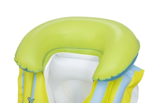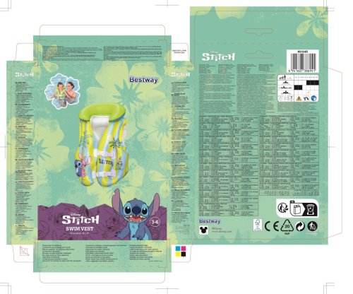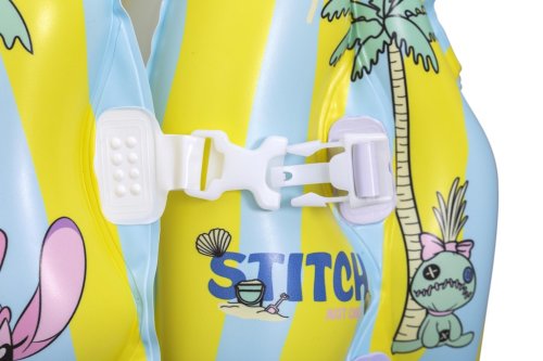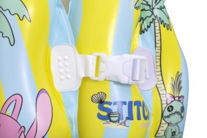 Vesta je vybavena praktickým nafukovacím límcem v jasně zelené barvě, který přidává na komfortu a zároveň pomáhá udržet hlavu dítěte nad hladinou. Celý design vesty je laděný do světlých pastelových barev – žluté a světle modré, které jsou doplněny hravými obrázky Stitche a dalších postaviček z této série. Na přední straně jsou dvě pevné, bílé plastové přezky s nastavitelným zapínáním, které umožňují snadné a bezpečné upevnění vesty na tělo dítěte.