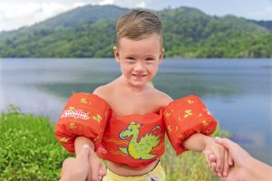Vesta Monster s rukávky je dětská plavecká vesta navržená pro děti ve věku od 2 do 6 let, která nabízí bezpečnost a pohodlí při pobytu ve vodě. Vesta má výraznou jasně oranžovou barvu a veselý motiv zeleného mořského netvora na přední straně, což zaujme malé plavce a zároveň usnadňuje dohled nad nimi. Vesta je vybavena dvěma nafukovacími rukávky, které zajišťují stabilitu a pomáhají dětem udržet se nad vodou.
