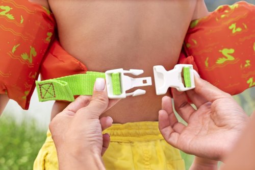 Vesta je opatřena zadní přezkou s nastavitelným zeleným popruhem, který umožňuje snadné a bezpečné upevnění na těle dítěte. Přezka je navržena tak, aby si ji dítě samo nedokázalo rozepnout, což přispívá k jeho bezpečnosti během vodních radovánek. Díky této konstrukci vesta pevně sedí a zajišťuje tak maximální komfort i ochranu během pohybu ve vodě.