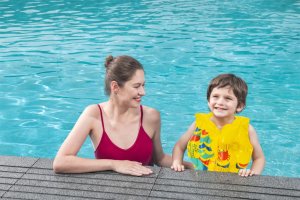 Plovací vesta pro děti od 3 do 6 let o velikosti 41×30 cm. Veselý design, dvě vzduchové komory. Vhodné pro děti o váze 19–30 kg. Dvě přezky na zapínání.