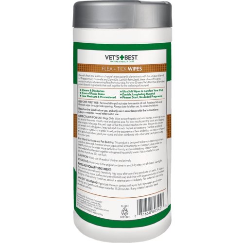 Utěrky proti blechám a klíšťatům Vet´s Best profitují z přidání nejsilnějších přírodních rostlinných extraktů s unikátní směsí mátového, citronelového a hřebíčkového oleje. Obsahují pouze přírodní a rostlinné složky a esenciální oleje. Tyto ultra měkké vlhčené ubrousky čistí a deodorizují srst Vašeho domácího mazlíčka a zároveň kontaktem zabíjejí blechy, bleší vajíčka a klíšťata a odpuzují komáry. Materiál utěrky neobsahuje plastové pryskyřice ani parfémy. Pokud se utěrky používají podle pokynů, jsou bezpečné a snadné k použití i na citlivých částech těla a lze je použít i na povrchy (např. obojky).