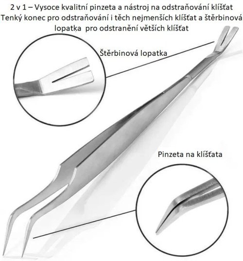 Vysoce kvalitní pinzeta z nerezavějící oceli určená k odstranění přisátých dospělých klíšťat a nymf klíšťat z lidí, psů, koček, koní a jiných domácích zvířat.