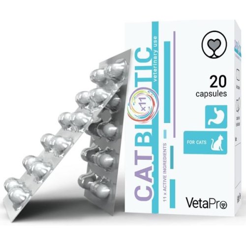 Cat Biotic je doplňkové krmivo pro kočky, které zachovává normální funkce střevní mikroflóry. Synbiotický doplněk probiotik a prebiotik podporuje správnou mikrobiální rovnováhu ve střevech a celkové zdraví trávicího traktu. Složení: frukto-oligosacharidy (FOS), mannan-oligosacharidy (MOS), kyselina máselná, dextróza, pektin, hydrolyzovaný živočišný protein (krůtí a kuřecí maso), stearan hořečnatý, želatinové (hovězí) tvrdé kapsle. Zootechnické doplňkové látky: (4b1705) Enterococcus faecium NCIMB 10415, Bacillus subtilis (4b1823). Technologické doplňkové látky: (E559) kaolin, (551c) křemelina (čištěná rozsivková zemina), (E 551b) koloidní oxid křemičitý. Návod k použití: 1–2 kapsle denně, nebo podle doporučení veterináře. Skladování: Skladujte na chladném a suchém místě, mimo přímé sluneční záření. Uchovávejte mimo dosah dětí. Upozornění: Určeno pouze pro zvířata!