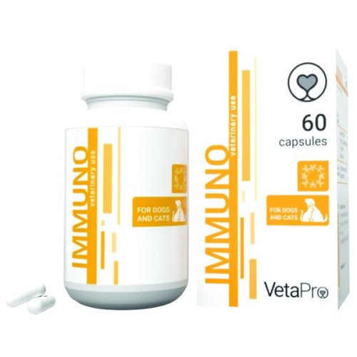 Immuno je nutriční doplněk pro psy a kočky k posílení buněčné a humorální nespecifické imunity, která je důležitá v boji proti virům, bakteriím a zhoubným buňkám. Doporučuje se podávat psům a kočkám, kteří jsou ohroženi nebo již trpí bakteriálními nebo virovými infekcemi, velmi mladým nebo starším jedincům, psům postiženým nádorovými onemocněními a také březím samicím. 13-1,3/1,6-glukan je látka, která se považuje za nejsilnější prostředek k ochraně a posílení imunity. Je jednou z nejznámějších substancí pro imunostimulaci používaná u psů a koček. Zvyšuje hladinu lgA a lgG, má přímý antimikrobiální účinek a zvyšuje účinnost vakcinace. Studie ukazují, že právě beta-glukan úspěšně buduje obranný systém organismu proti virovým, bakteriálním, plísňovým, parazitárním a jiným patogenům, čímž následně vytváří velmi silnou imunologickou reakci v organismu. Obranné buňky jsou po stimulaci beta-glukanem 7× aktivnější. Vitamín C posiluje imunitu a stimuluje funkci bílých krvinek, čímž přirozeně podporuje obranný systém kůže a pomáhá k rychlejšímu hojení ran. Je silným antioxidantem, díky čemuž snižuje riziko vzniku chronických chorob. Zinek je mimořádně důležitý, neboť je součástí téměř všech biologických procesů. Je spolučinitelem více než 300 enzymů kontrolujících vitální procesy. Bez zinku se organismus nedokáže bránit (podporuje vznik obranných molekul v organismu), je součástí syntézy DNA, výroby spermií, má silný antioxidační účinek, čímž chrání tělo před volnými radikály, zlepšuje zdraví kostí a zubů a snižuje riziko různých degenerativních změn. Kyselina listová (vitamín B9) příznivě ovlivňuje metabolismus, funkci kardiovaskulární soustavy, nervové soustavy, pomáhá proti anémii a výrazně zpomaluje procesy stárnutí. Složení: 13-glukan a mannan-oligosacharidy 500 mg/g Doplňkové látky na 1 g: vitamín C 100 mg, oxid zinečnatý 10 mg, kyselina listová 0,5 mg. Dávkování: do 15 kg hmotnosti: 1 kapsle denně, nad 15 kg hmotnosti: 2 kapsle denně, nebo podle pokynů veterináře. Kapsli lze podat zvířeti celou přímo na kořen jazyka, nebo lze její obsah přimíchat do krmiva. Skladování: Skladujte na chladném a suchém místě, mimo dosah přímého slunečního záření. Uchovávejte mimo dosah dětí. Upozornění: Určeno pouze pro zvířata!