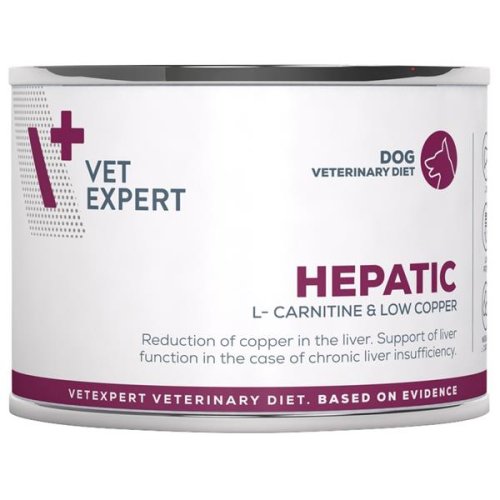 VetExpert VD 4T Hepatic Dog konzerva je kompletní dietní krmivo pro psy, které podporuje funkci jater při chronické jaterní nedostatečnosti. Receptura obsahuje snadno stravitelný kuřecí protein a ingredience s nízkým obsahem mědi, které snižují její akumulaci v organismu. Díky obsahu prebiotik FOS a MOS přispívá k rovnováze střevní mikroflóry a zároveň stimuluje obranyschopnost. DL-methionin podporuje funkci jaterních buněk. Hlavní benefity: