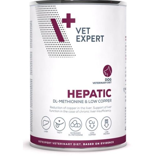 VetExpert VD 4T Hepatic Dog konzerva je kompletní dietní krmivo pro psy, které podporuje funkci jater při chronické jaterní nedostatečnosti. Receptura obsahuje snadno stravitelný kuřecí protein a ingredience s nízkým obsahem mědi, které snižují její akumulaci v organismu. Díky obsahu prebiotik FOS a MOS přispívá k rovnováze střevní mikroflóry a zároveň stimuluje obranyschopnost. DL-methionin podporuje funkci jaterních buněk. Hlavní benefity: