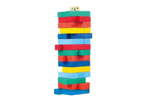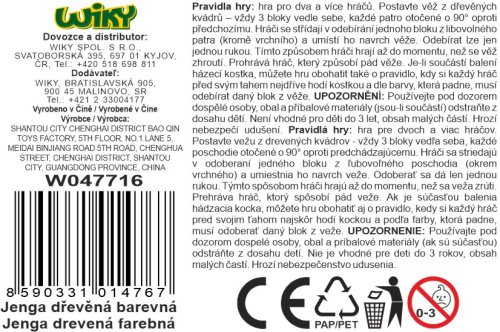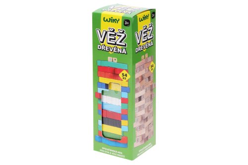 Věž dřevěná barevná. 54 dílků. Rozměry poskládané věže 6,3x6,3x20 cm, jednoho dílku 6,3x2,1x1,1 cm. Český obal.