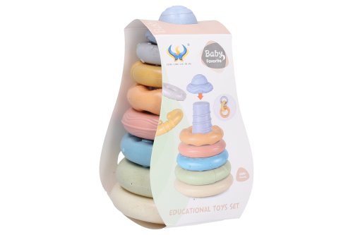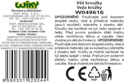 Věž kroužky na tyčce. Velikost 20cm. Kroužky zle navlékat na tyč, nebo spojovat v řetěz.
