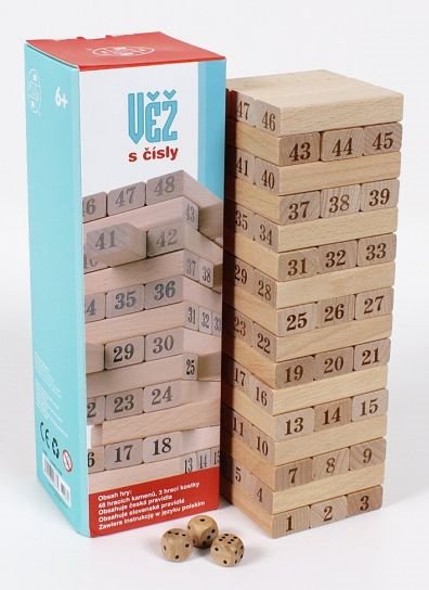 Jak moc jsi šikovný? Věž je novou obměnou klasické hry dříve známé jako "Jenga". Na dřevěných kamenech jsou čísla pro širší využití celé hry. Součástí hry jsou také hrací kostky. Proto lze hrát klasickou Věž, nebo použít kostky a pohrát si s čísly. Například házet jen jednou kostkou a podle toho, jaké číslo padne, tolik musí hráč vytáhnout kamenů a umístit je nahoru na věž. Nebo můžete házet všemi kostkami a kombinovat hozená čísla, jak potřebujete (sčítat, násobit). Doporučeno pro děti od 6 let. Hra obsahuje: 48 hracích kamenů, 3 hrací kostky a pravidla.