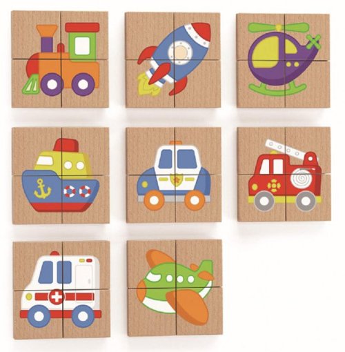 Osm skládaček s dopravními prostředky vyrobených z vysoce kvalitního dřeva. 32 čtverečků je opatřeno magnetickou vrstvou, která umožňuje skládání a následné hraní na lednici, magnetické tabuli či jiném kovovém povrchu. Součástí výrobku je i látkový pytlík. Skládáním puzzle si děti procvičují logiku, představivost, koordinaci oko - ruka. Rozměr jednoho dílku je 4x4x1 cm. Vhodné pro děti od 18 měsíců. Rozměr složeného puzzle cca 8 x 8 cm