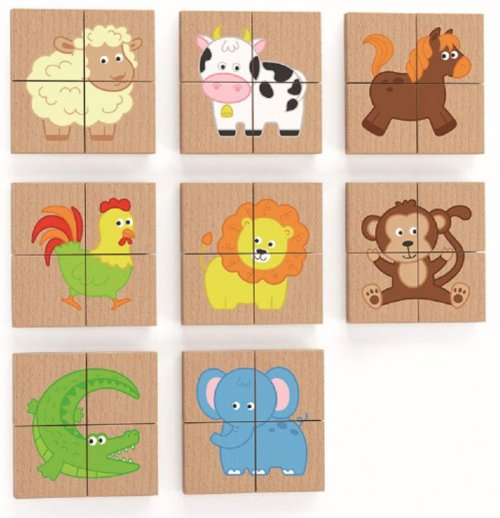 Osm skládaček se zvířátky vyrobených z vysoce kvalitního dřeva. 32 čtverečků je opatřeno magnetickou vrstvou, která umožňuje skládání a následné hraní na lednici, magnetické tabuli či jiném kovovém povrchu. Součástí výrobku je i látkový pytlík. Skládáním puzzle si děti procvičují logiku, představivost, koordinaci oko - ruka. Rozměr jednoho dílku je 4x4x1 cm. Vhodné pro děti od 18 měsíců. Rozměr složeného puzzle cca 8 x 8 cm