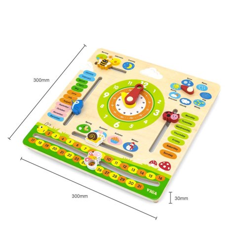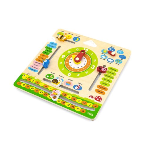 Dřevěný kalendář v českém jazyce je edukativní hračka, která děti seznámí hned s několika potřebnými věcmi. Hodinové ručičky, stejně jako ukazatel počasí a ročního období, jsou pohyblivé. Děti se seznámí: