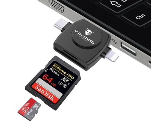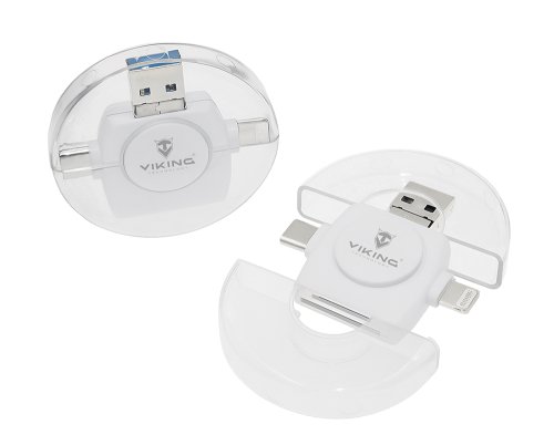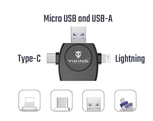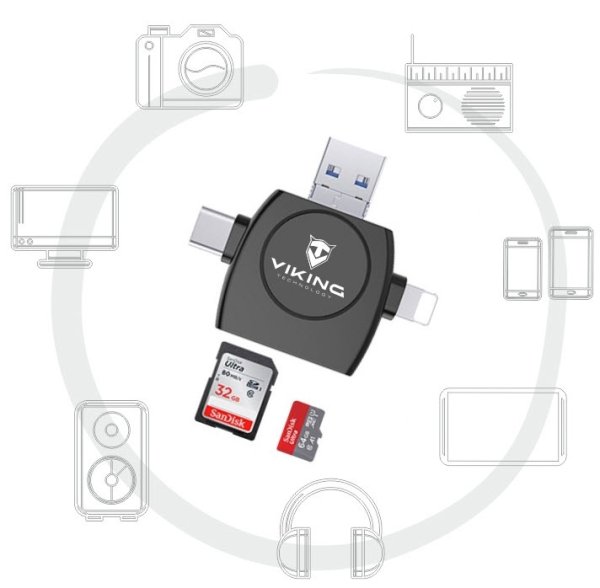 Viking čtečka paměťových karet V4 USB3.0 4v1 • 4 konektory: Lightning, Micro USB, USB-A 3.0, USB-C • Vhodný pro iOS, Android, Windows i Linux • Podpora většiny běžných formátů souborů • Rozšíření paměti telefonu, tabletu nebo notebooku • Malé, lehké zařízení s ochranným pouzdrem • hmotnost 10g